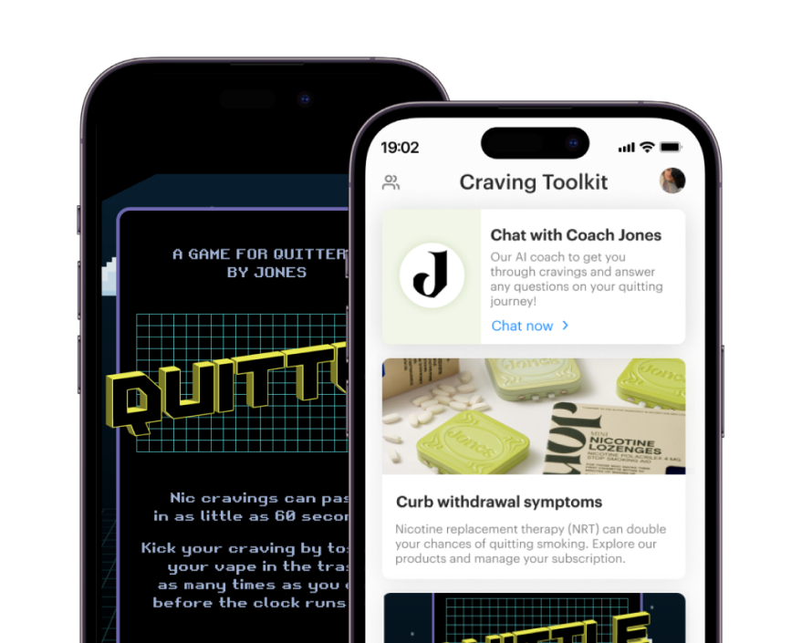 Chat with Coach Jones, get FDA-approved Nicotine Replacement Therapy (NRT), and play games to get through your cravings.